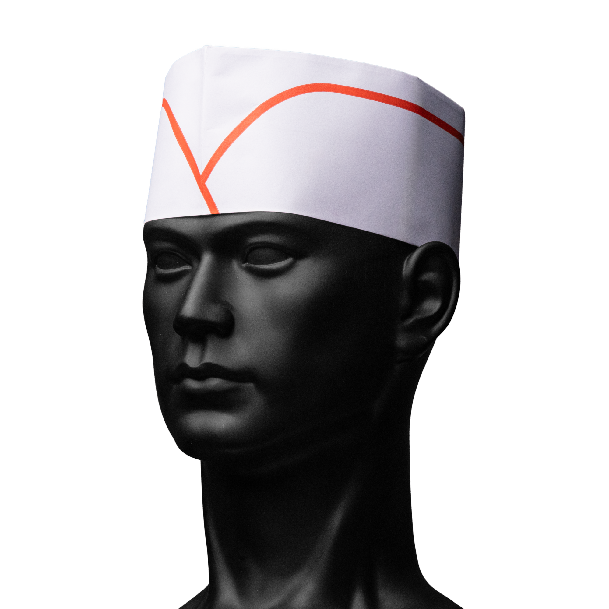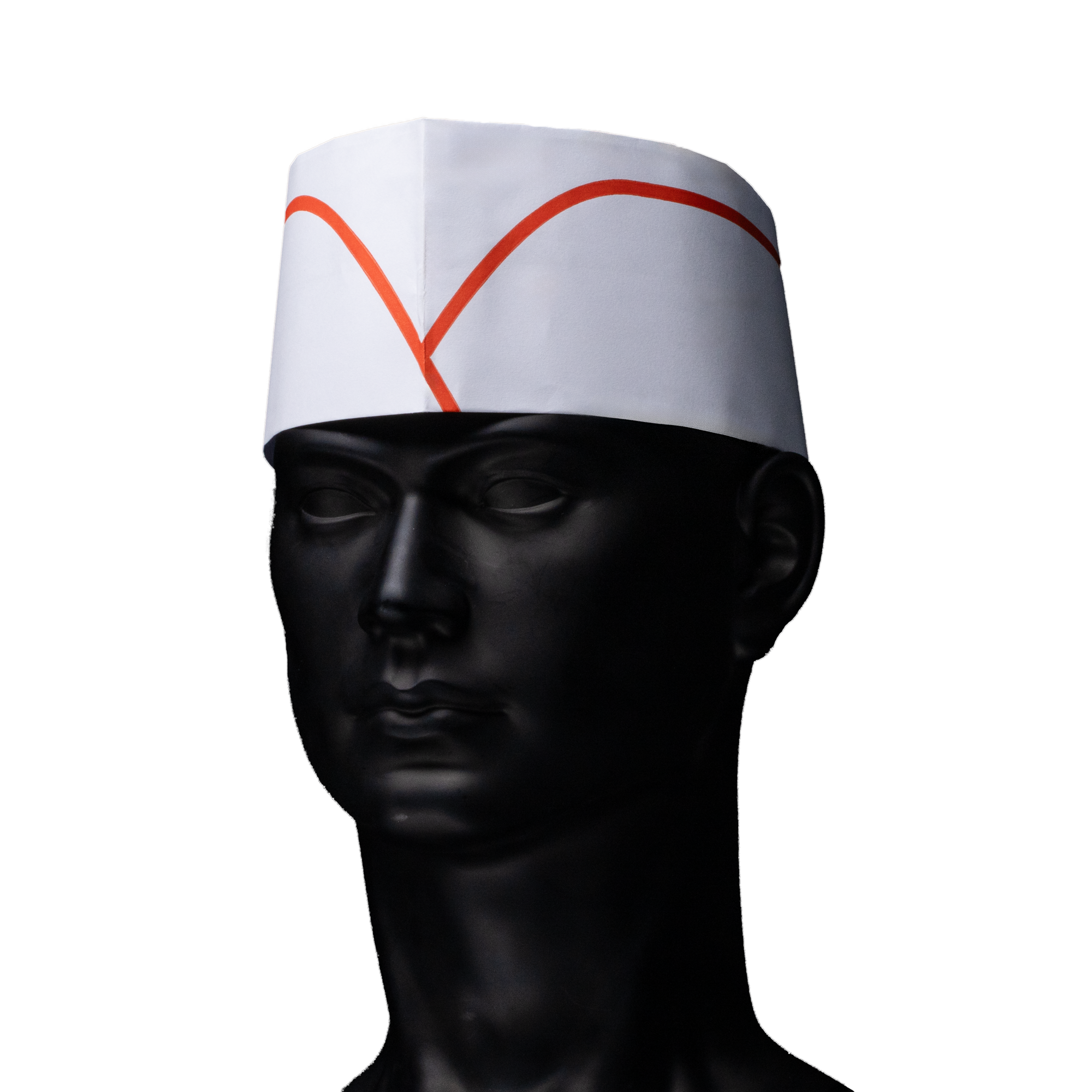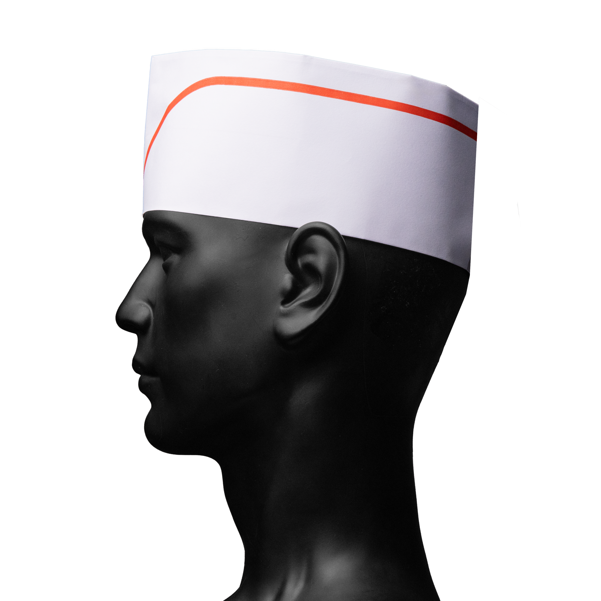 Produktinformationen "Papierschiffchen mit Vlieskrone, Farbe weiß mit rotem Streifen: Größeverstellbare Kopfbedeckung für Küche und Catering als Hygieneschutz kaufen."