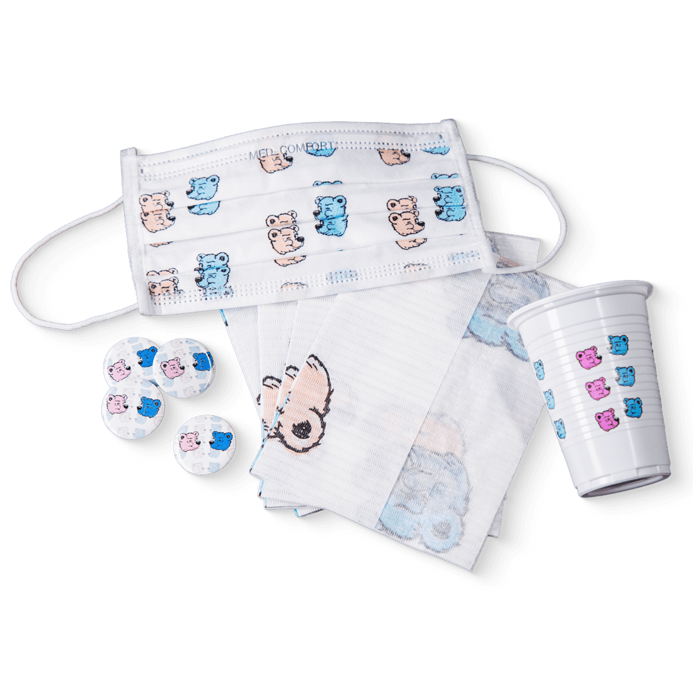 Produktinformationen "Happy Kids Dental Bedarf, Bärchendruck: mit Pin-Buttons, Einwegmasken als Mundschutz, Patientenservietten und Mundspülbechern für fröhliche Kinder bei zahnärztlichen Behandlungen kaufen."
