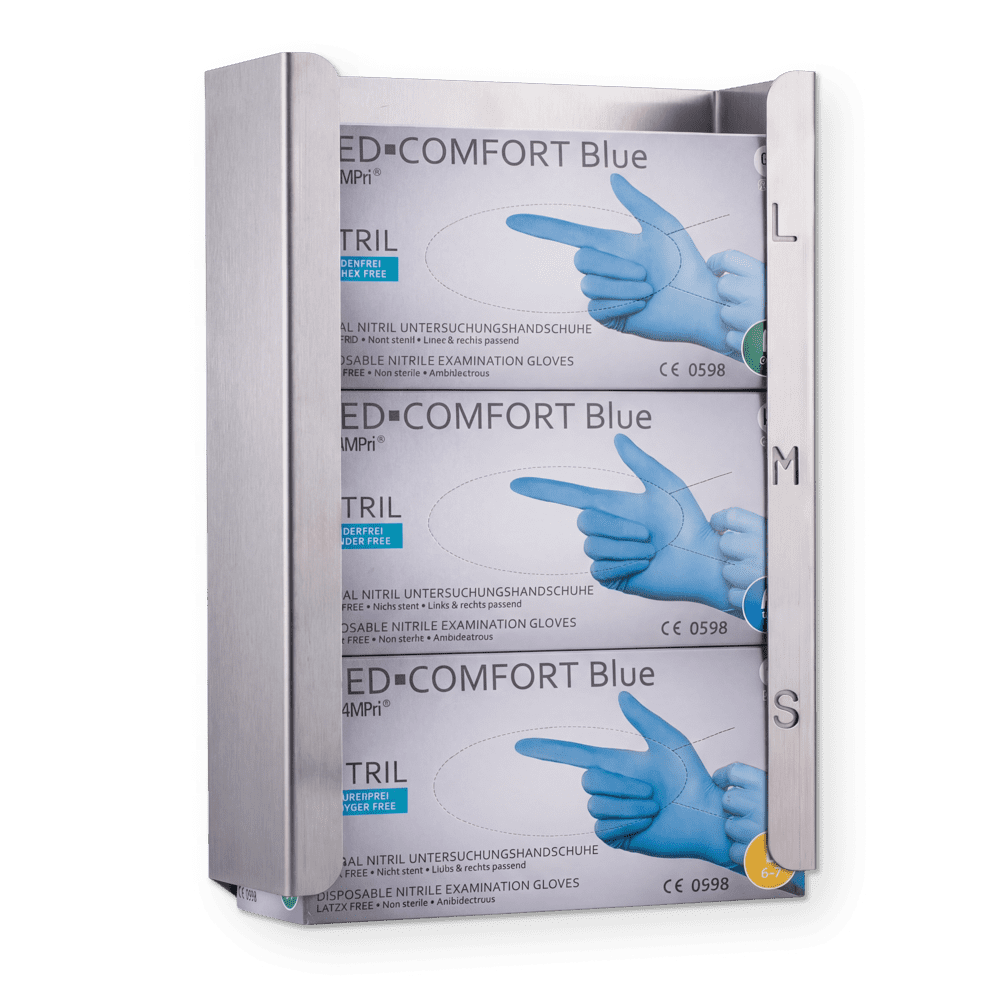 Ungestörter Ablauf, Hygiene und vorausschauendes Handeln sind auf Krankhausstationen, in Praxen oder Pflegeeinrichtungen von entscheidender Bedeutung, damit sich das Personal gut vorbereiten kann und Patienten oder betreute Personen sich wohl fühlen. Daher sind Spender für notwendige Verbrauchsmaterialien unersetzbar, weil sie zügige Prozesse am Laufen halten und hygienisch sind. Aus dem Dispenserhalter können Sie Einmalhandschuhe einzeln entnehmen, ohne dass die übrigen Exemplare herausfallen. Schutzkleidung allgemein soll verhindern, dass mögliche Erreger oder Verschmutzung vom Körper oder Kleidung einer Person an eine andere weiter verbreitet werden. Besonders elementar ist das natürlich zwischen medizinischem Personal und den behandelten Personen. Einmalhandschuh nehmen daher eine herausgehobene Rolle für die Hygiene ein.Edelstahl kann eine gute Beständigkeit gegen Metallermüdung vorweisen. Dadurch bleibt die ursprüngliche Form auch bei häufiger Benutzung erhalten.