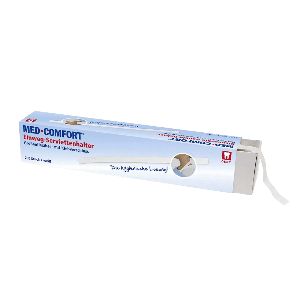 Produktinformationen "Einweg Patientenserviettenhalter selbstklebend, weiß, Med-Comfort: elastische Halter für Dentalservietten als Praxisbedarf kaufen."