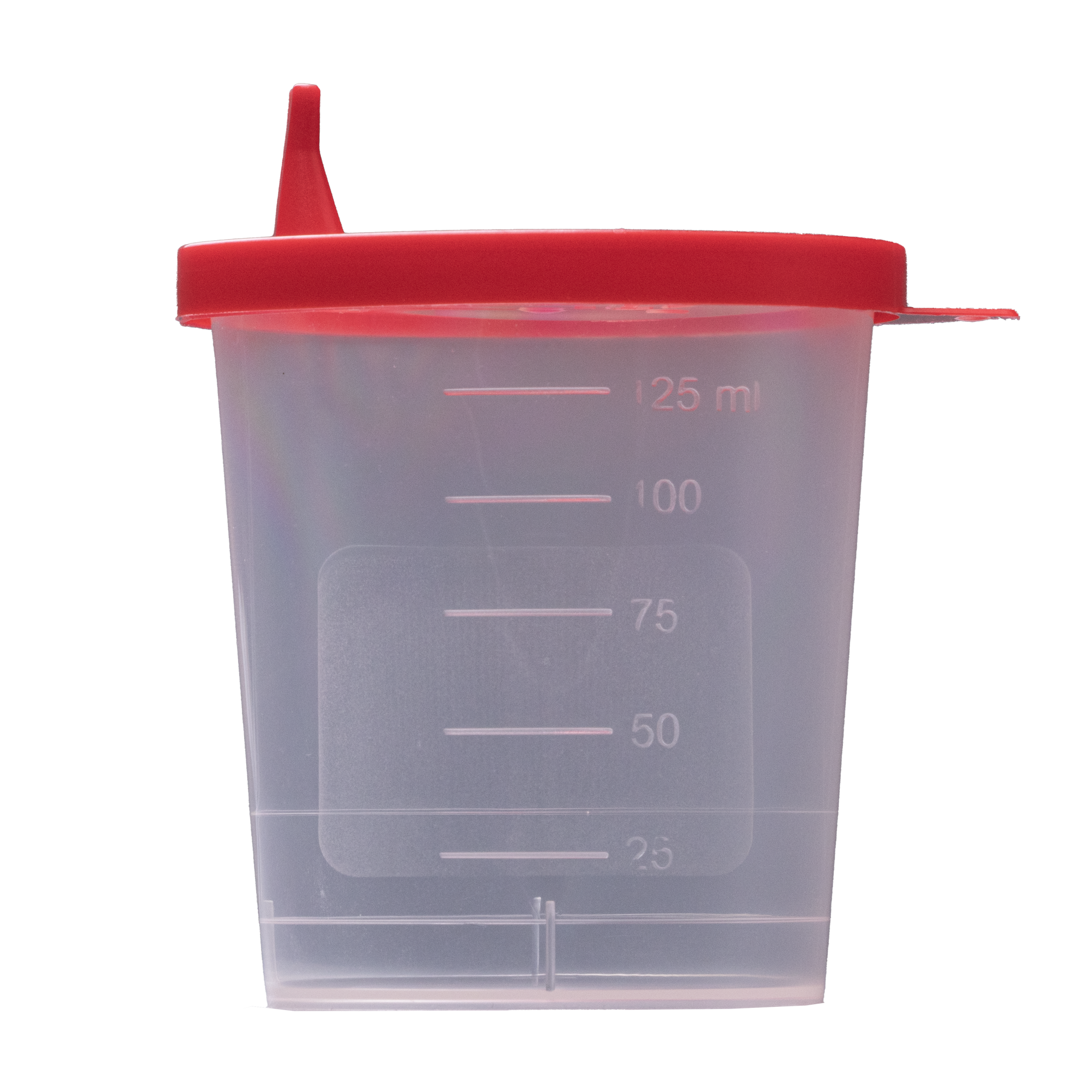 Produktinformationen "PP Urinsammelbehälter mit Schnappdeckel, 125 ml, Farbe transparent, milchig, rot, 500 Stück Becher mit Deckel: graduierter Urinbecher zum sicheren Transport von Urin als Stations- und Patientenbedarf kaufen."